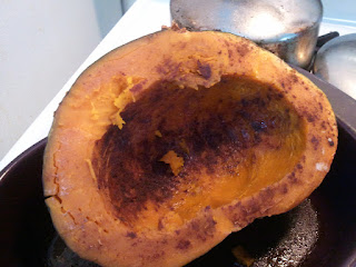 I recently learned about kabocha squash through a status that The Fighter Diet posted on Facebook last week. She said " If more people ate kabocha instead of roasted potatoes the world would be less fat". My first thought...she is hilarious...second thought...I must try this kabocha. I ran out after work that very same night and picked one up at a market. It looks like a cute half-size green and orangish pumpkin. The kabocha squash is also called a Japanese pumpkin, so that might throw you off when looking for it at the store.